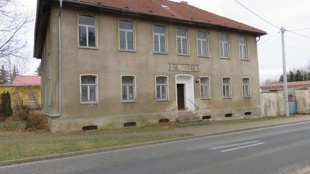 Das II-geschossige Gebäude wurde um 1950 auf dem insgesamt 879 m² großen Eck-Grundstück erbaut. Darauf befinden sich noch, die auf der rechten Seite des Hauses liegende Grundstückszufahrt, eine Garage und ein Stallgebäude. Dieses ist nur bedingt nutzbar. Im Gartenbereich ist eine Zisterne eingebettet. Das Grundstück ist im hinteren Bereich umlaufend mit Maschendrahtzaun eingefriedet und der Gartenbereich grenzt direkt an die Kindertagesstätte. Der seitliche Bereich mit seinem Ausgang ist teilweise von Baumbestand umrandet. Die bebaute Fläche des Grundstücks ist ca. 215 m² groß, die unbebaute ca. 664 m².