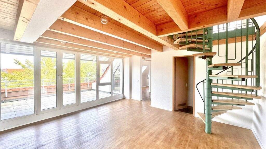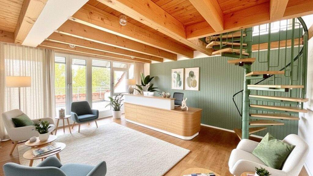 Das Herzstück bildet ein heller, großzügig geschnittener Raum, der als Empfangs- und Wartebereich dienen könnte. Von hier aus gelangt man direkt auf die sonnige Dachterrasse, die für entspannte Pausen oder eine angenehme Arbeitsatmosphäre sorgt.