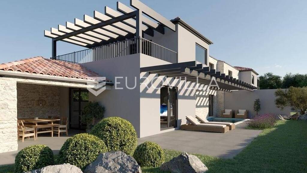 Istra, Sisan - novo u ponudi, prekrasna moderna dvojna kuca s bazenom. Nekretnina se sastoji od prizemlja i prvog kata. Na prizemlju nekretnine docekat ce vas ulazno predsoblje s prostorom za garderobu nakon kojeg se ulazi u prostrani dnevni boravak s kuhinjom i blagovaonicom. Posebnost nekretnine je u velikim staklenim stijenkama koje dovode dnevnu svjetlost prostoriji uz predivan pogled na vrt, bazen i ljetnu terasu. u prizemlju nekretnine nalazi se i prva spavaca soba s kupaonicom, a posjeduje jos i pristup bazenu i vrtu. U predvorju kuce nalazi se ostava ili spremiste ispod stepenica koje nas vode na drugi kat nekretnine. Na drugom katu pronalazimo ostale dvije spavace sobe s vlastitim kupaonicama. Jedna spavaca soba osmisljena kao ''master room'' posjeduje prostranu terasu gdje je zamisljena spa zona s hidro-masaznom kadom i lezaljkama. Nekretnina u vrtu dodatno ima i natkrivenu ljetnu kuhinju koja odise istarskim stilom gradnje. Nekretnina se prodaje bez opreme te je u fazi gradnje. U svim prostorijama pametni klima uredaji s inverterom i visokokvalitetna troslojna stolarija. Kraj izgradnje planiran je za svibanj 2025. godine. Nekretnina se gradi na fizicko ime. Za vise informacija stojim na raspolaganju.... Vise na eurovilla.hr, ID: 969510