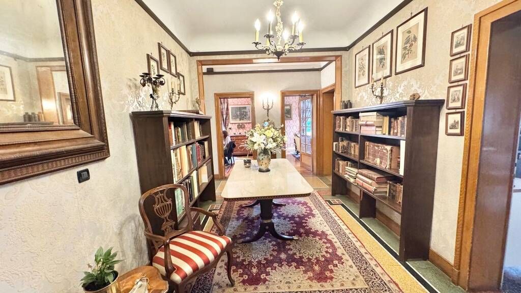 Der Ort bietet Einkaufsmöglichkeiten, Post usw. Die Villa erstreckt sich auf 4 Etagen und bietet eine Wohnnutzfläche von ca. 1.000 qm und ist wie folgt aufgeteilt: EG: großer Eingangsbereich, Wohnzimmer mit Kamin, Esszimmer, Wohnküche, Veranda, 2 große Doppelschlafzimmer und ein Badezimmer. OG: großer Eingangsbereich, fünf große Doppelschlafzimmer, Balkon, eine Veranda und ein Badezimmer. Von dieser Etage haben Sie Zugang zum Turmzimmer und zu den zwei Dachböden. Souterrain: große Garage, Abstellraum, zwei Kellerräume, Heizung und Technikraum. Der eingezäunte Garten der Villa hat eine Größe von ca. 2.800 qm.