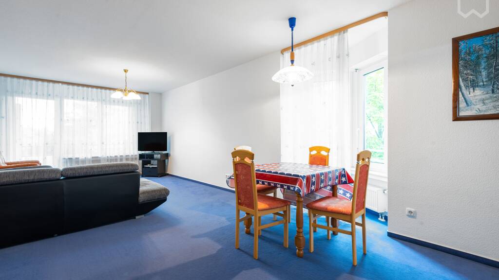Diese schöne komplett ausgestattete Wohnung liegt im Grünen. Das Stadtzentrum ist in nur 10 min. zu Fuß zu erreichen. Ein Lebensmittelladen befindet sich in unmittelbarer Nähe. Vom Balkon kann man schön ins Grüne schauen. Öffentliche Verkehrsmittel sind fußläufig zu erreichen.