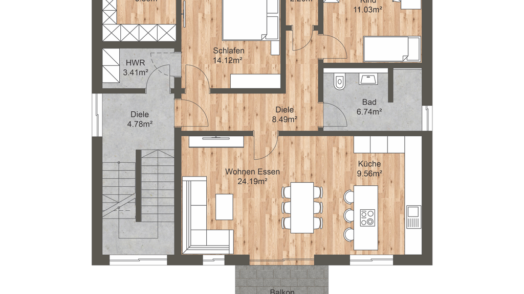 Die Wohnungen überzeugen zudem durch eine durchdachte und alltagstaugliche Raumaufteilung. Herzstück jeder Einheit ist der großzügige Wohn- und Essbereich mit offener Küche, der ein modernes, kommunikatives Wohnen ermöglicht. Von hier aus gelangen Sie direkt auf den jeweiligen Balkon oder die Terrasse und erweitern den Wohnraum harmonisch ins Freie.