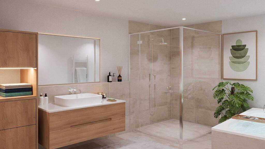 Hoch über den Dächern des Katzenbergs thront dieses exklusive Penthouse und bietet einen atemberaubenden Fernblick, der seinesgleichen sucht. Mit dem Aufzug gelangen Sie direkt in die dritte Ebene, wo sich diese außergewöhnliche Residenz über die gesamte Fläche des Hauses B erstreckt. Beim Betreten der Wohnung empfängt Sie zur Linken ein großzügiger Abstellraum mit ausreichend Platz für Ihre Waschmaschine und zusätzlichen Stauraum. Anschließend betreten Sie das lichtdurchflutete Tageslichtbad, ausgestattet mit einer begehbaren Dusche, die modernen Komfort mit elegantem Design verbindet. Der weitläufige Wohn-, Koch- und Essbereich bildet das Herzstück dieses Penthouses. Auf einer beeindruckenden Fläche bietet die Küche ausreichend Platz für eine stilvolle Kochinsel, die zum gemeinsamen Kochen und Verweilen einlädt. Ein hochwertiges Hebe-Schiebe-Element führt Sie von hier aus direkt auf die großzügige Terrasse, die nach Süden ausgerichtet ist und Ihnen sonnige Stunden mit unvergleichlichem Ausblick ermöglicht. Angrenzend an den Wohnbereich befindet sich ein nach Norden ausgerichtetes Homeoffice, das Ruhe und Inspiration für produktives Arbeiten bietet. Daneben liegt ein geräumiges Kinderzimmer, das vielfältige Gestaltungsmöglichkeiten offenlässt. Das Elternschlafzimmer überzeugt mit einer begehbaren Ankleide und bietet ebenfalls direkten Zugang zur Terrasse, sodass Sie den Tag mit einem Blick über die Stadt beginnen und ausklingen lassen können. Dieses Penthouse vereint luxuriöses Wohnen mit durchdachter Architektur und bietet Ihnen ein Zuhause, das höchsten Ansprüchen gerecht wird.