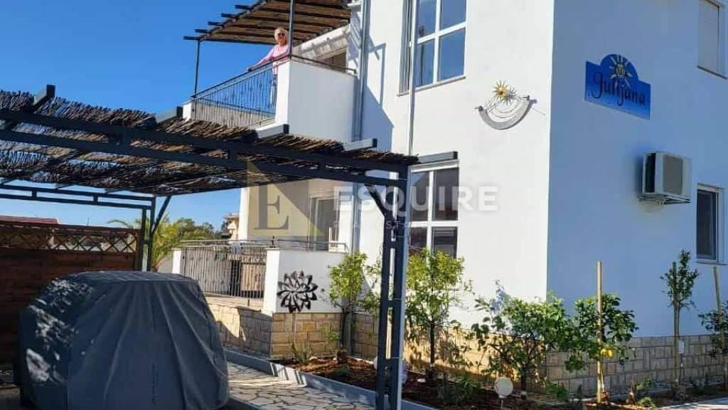 Zum Verkauf steht ein zweistöckiges Haus auf einem 1050 m² großen Grundstück, mit zwei getrennten Wohneinheiten, jeweils auf einer eigenen Etage. Jede Etage besteht aus einem Eingangsbereich, zwei Schlafzimmern, einem Wohnzimmer mit Küche und Essbereich, einem Badezimmer sowie einer Terrasse mit einer Nutzfläche von 90 m². Für Heizung und Kühlung wird eine Klimaanlage verwendet.