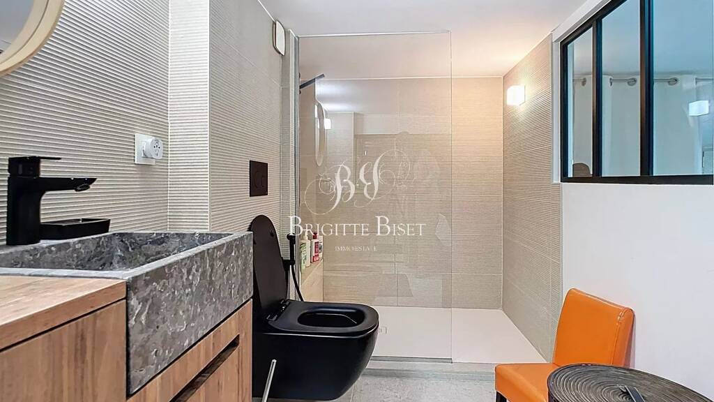 Die Agentur Brigitte Biset bietet Ihnen in Co-Exklusivität eine 84 m² Wohnfläche umfassende Maisonette-Wohnung in Erdgeschosshöhe, 48,89 m² "loi Carrez", bestehend aus einem Eingangsbereich, Wohnzimmer mit offener, komplett ausgestatteter Küche, einer wunderschönen, geschlossenen Pergola von 15 m² mit Zugang zu einer schönen Terrasse von 33 m², Ostlage und wunderschöner Meerblick, einem Schlafzimmer im Erdgeschoss en Suite mit Bad und einem Gäste-WC. Im Obergeschoss ein Elternsuite mit Kleiderschränken und Bad/Dusche/WC.