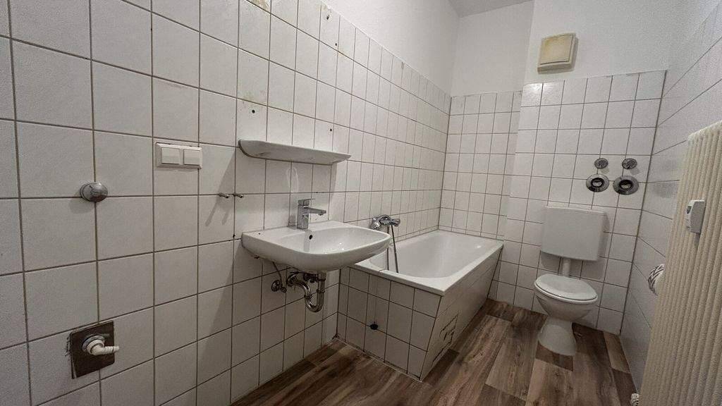 Wohnzimmer, Schlafzimmer, Diele, Küche und Bad. Weißes Badezimmer mit Badewanne und Waschmaschinenstellplatz