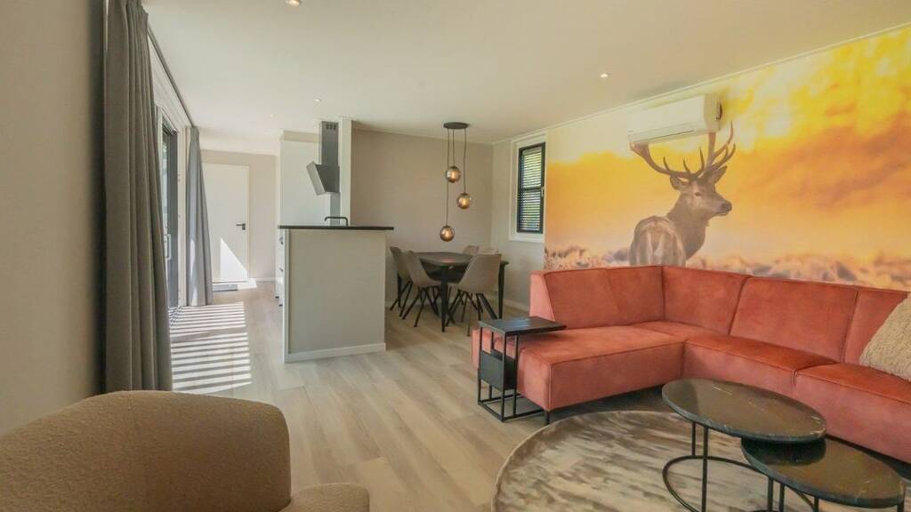 Das geräumige Wohnzimmer bildet das Herz dieses Luxus-Chalets und strahlt Wärme und Stil durch das auffällige künstlerische Wandgemälde mit Hirschmotiv im Sonnenuntergang aus. Diese einzigartige Wanddekoration schafft eine stimmungsvolle und persönliche Ausstrahlung, die das Chalet von anderen Ferienhäusern unterscheidet. Das luxuriöse orange Ecksofa bildet einen wunderschönen Farbakzent und lädt zur Entspannung ein. Moderne Designbeleuchtung mit gläsernen Hängelampen sorgt für stimmungsvolle Beleuchtung während der Abendstunden. Die offene Verbindung zur Küche schafft ein räumliches Gefühl und macht es ideal für gesellige Abende. Große Fenster bieten Blick auf den grünen Ferienpark und sorgen für optimalen Lichteinfall. Die Qualität der Ausstattung ist überall in den klaren Linien und durchdachten Aufteilung sichtbar