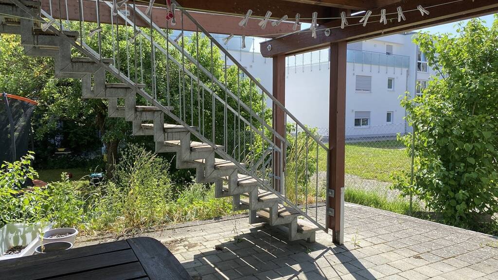 Nach Eintritt im Erdgeschoss gelangen Sie linker Hand in die Teilunterkellerung des Gebäudes, rechter Hand befindet sich die Garage. Geradeaus gelangen Sie durch einen Abstellraum auch direkt zur Terrasse im Erdgeschoss und den Gartenbereich. Das 1. Obergeschoss beherbergt das Wohnzimmer, ein Badezimmer mit Wanne und Dusche aus dem Jahr ca. 1990 und die schöne und offen gestaltete Essküche. Von hier aus ist der Zugang zur Südwestterrasse mit gewährleistet. Eine Edelstahltreppe ermöglicht Ihnen von der Terrasse aus einen direkt Zugang zum Garten. Im zweiten Obergeschoss befinden sich insgesamt 3 Zimmer und ein weiteres Badezimmer (aus den 60-er Jahren). Das helle und geräumige Dachgeschoss bietet Ihnen nochmals eine 2 Zimmerwohnung mit Essküche, Duschbad und großem Wohnbereich. Von hier aus geleitet Sie die Wendeltreppe in den als Schlafzimmer umgebauten Dachspitz. Insgesamt finden Sie somit ca. 159 m² Wohnfläche vor, verteilt auf 7,5 Zimmer, 3 Badezimmer und 2 Küchen.