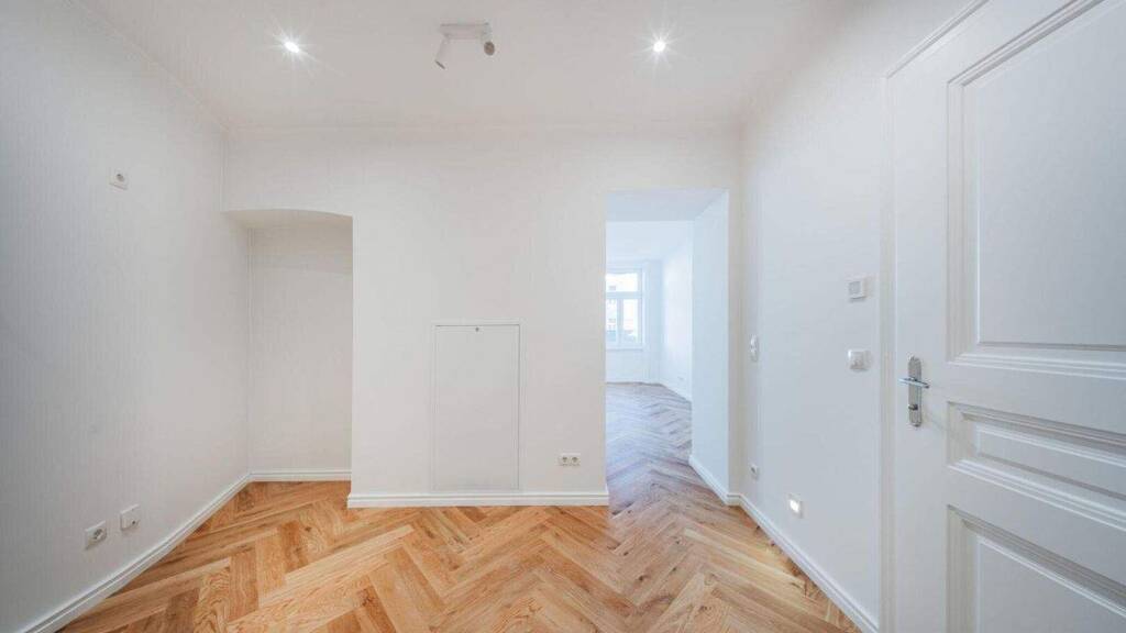 Diese moderne Altbauwohnung überzeugt mit Ihrem durchdachten Grundriss. Der Wohnraum ist westlich ausgerichtet. Für eine optimale Nutzung der Fläche, ist im Vorraum die offene Küche geplant, welche genügend Platz für einen Esstisch bietet. Ebenfalls im Eingangsbereich der Wohnung befindet sich das Badezimmer. Dieses ist mit hochwertigem Feinsteinzeug und Markenarmaturen ausgestattet und beinhaltet eine moderne Walk-In Dusche, sowie ein Handwaschbecken und einen Waschmaschinenanschluss. Straßenseitig ausgerichtet befindet sich der einladend, offen gestaltete Wohnraum.