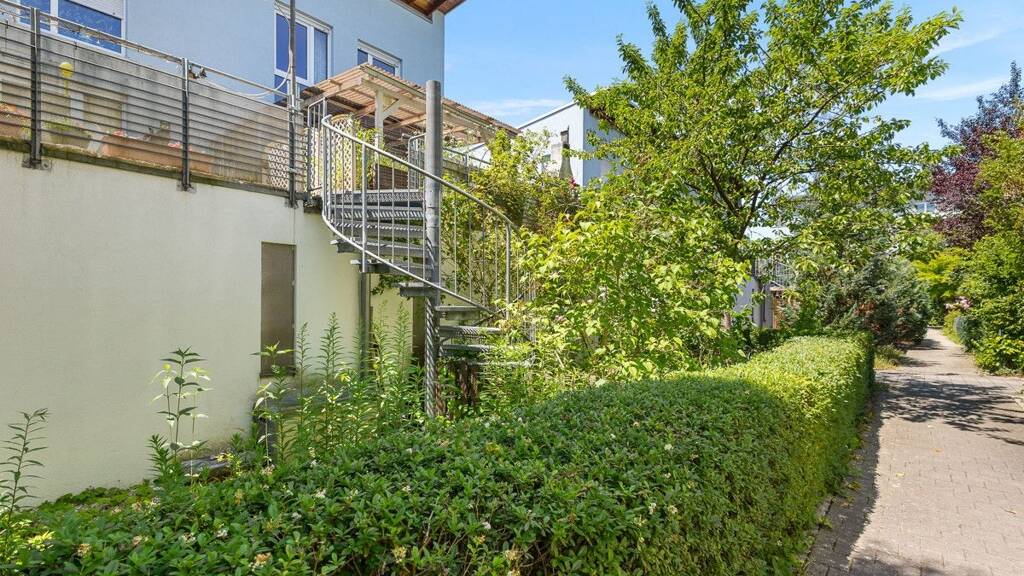 Der Balkon bzw. die ca. 24 m² große Terrasse ist überdacht und mit einer Wendeltreppe an den Garten angebunden.