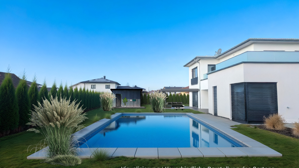 Das ca. 2.458 m² große Grundstück lässt keine Wünsche offen und kann individuell nach Ihren Wünschen blickdicht bepflanzt werden. Auch für einen Naturbadeteich oder für einen Außen-Pool neben der großen Sonnenterrasse ist ausreichend Platz. Die Vorbereitungen für einen Swimmingpool sind bereits vorhanden. Im Garten befindet sich eine Bewässerungsanlage, sowie eine große Regenwasserzisterne. Ein großer Fitnessraum und eine Vorbereitung für eine Sauna sind im Obergeschoss vorhanden. Auf dem Dach kann eine Photovoltaikanlge angebracht werden. Im Haus befindet sich eine Entkalkungsanlage.