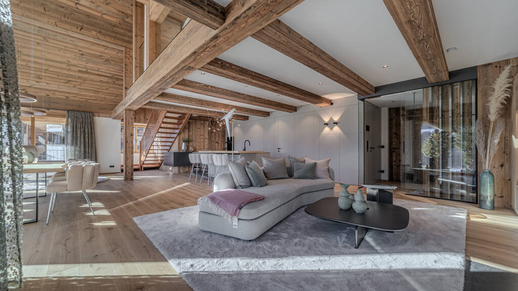 Dieser zweistöckige Wohntraum, verkörpert ein gelungenes "Haus-in-Haus"-Konzept, welches dem neuen Eigentümer keine Wünsche offenlässt. Angekommen im oberen Stockwerk dieser Liegenschaft, das Sie komfortable über den Lift erreichen, offenbart sich der großzügige Wohn- und Essbereich mit offenem Kamin (Holz) und Loungebereich der sich über einen Großteil der oberen Etage mit rund 90 m² erstreckt. Lichtdurchflutet präsentiert sich dieser einmalige Wohnbereich, mit modernen sowie traditionellen Elementen. Hier haben die Bauherren mit höchster Sorgfalt darauf geachtet nur die besten Materialien und technischen Einrichtungen zu verbauen. Ein Wohntraum, der Sie sofort überzeugen und in seinen Bann ziehen wird. Ein moderner offener Kamin verleiht diesen Räumlichkeiten eine warme Atmosphäre und lädt Sie zum romantischen Verweilen ein. Im Loungebereich können Sie sich entspannt niederlassen und das einzigartige Ambiente gepaart mit einem sagenhaften Ausblick auf die umliegende Bergwelt genießen und auf sich wirken lassen. Eine große Sonnenterrasse, wunderschön bepflanzt und mit automatischer Bewässerung versehen, ermöglichen Ihnen an warmen Tagen, die Sonne und die gute Bergluft genießen. Eine Designerküche samt angrenzendem Barbereich platziert sich als Dreh- und Angelpunkt der Luxuswohnung. Gekonnt fügt sie sich in das moderne sowie traditionelle Ambiente ein und lässt die Herzen aller Hobbyköche oder die, die einer werden wollen, höherschlagen. Zwei komplett eingerichtete Schlafzimmer mit Bädern ensuite runden diese Etage entsprechend ab. Von der obersten Etage dieser außergewöhnlichen Liegenschaft werden Sie dann mit Sicherheit restlos begeistert sein. Die Mastersuite besticht sowohl durch ihre Großzügigkeit als auch durch das fantastische Design und die hochwertigsten Materialien. Lichtdurchflutet präsentiert sich dieser Bereich mit einem großzügig und hellen Badezimmer. Zwei schöne Balkone lassen den Tag mit den ersten Sonnenstrahlen gut beginnen. Der perfekt ins Wohnkonzept integrierte Wellnessbereich ist ohnehin über jeden Zweifel erhaben und punktet mit einer freistehenden Badewanne, einer stylischen Sauna und einem Loungebereich. Der Ausblick auf die Berge ist atemberaubend. Eine urgemütliche Loggia rundet dieses Wohnerlebnis auf der obersten Ebene ab. Auch für Ihren Fuhrpark gestaltet sich das Erreichen der drei Garagenstellplätze und der Außenstellplätze durch eine beheizte Hauszufahrt sehr komfortabel und problemlos. Ein eigner circa 20 Quadratmeter großer und voll ausgestattetes Kellerraum freut sich darauf, von Ihnen befüllt zu werden. Im Gesamten bleibt festzuhalten, dass diese Liegenschaft durch ihre besonders hochwertige und luxuriöse Designer-Ausstattung eine absolute Einmaligkeit und Rarität auf dem Kitzbüheler Immobilienmarkt in dieser Lage darstellt.