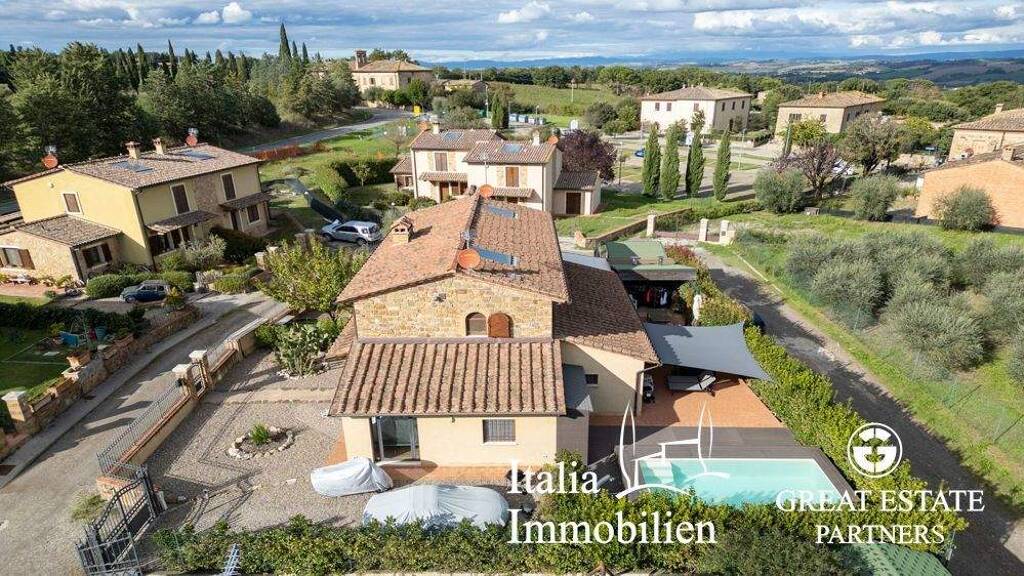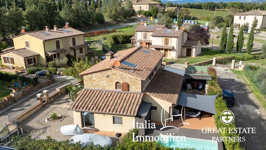 Diese schöne halbe Villa, die auf 3 Seiten frei steht und 130 m² groß ist, befindet sich in der Gemeinde Buonconvento und erstreckt sich über zwei Ebenen. Im Erdgeschoss gelangt man in ein geräumiges Wohnzimmer mit Kamin, von dem aus man Zugang zu Küche, Bad, Waschküche, Arbeitszimmer und einem praktischen Abstellraum unter der Treppe hat. Im ersten Stock befindet sich der Schlafbereich mit zwei Schlafzimmern und einem Badezimmer. Im Außenbereich gibt es einen 55 m² großen Parkplatz und einen 169 m² großen Innenhof mit einem Swimmingpool mit Salzanlage.