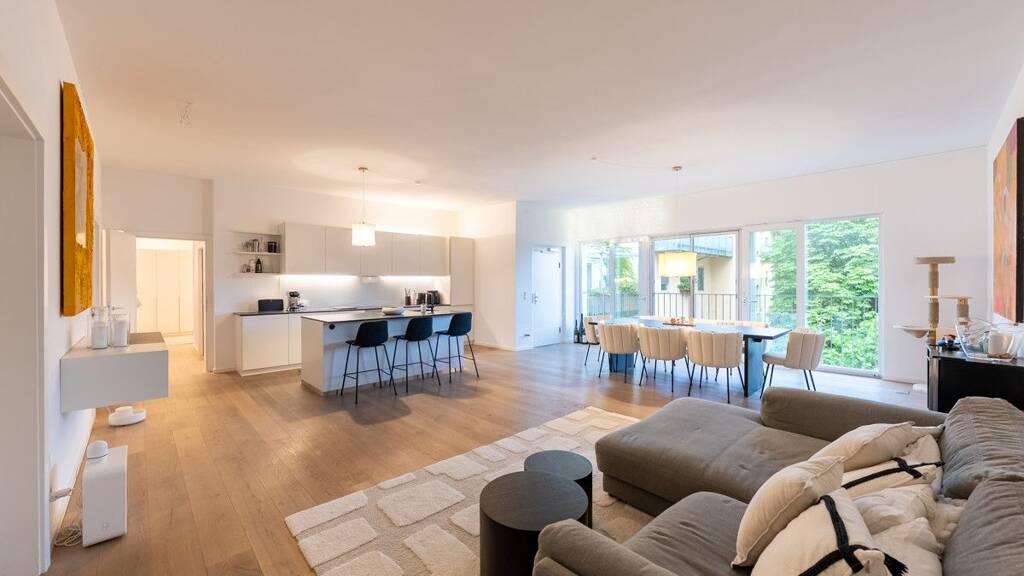 Ein echtes Highlight ist der rund 50?m² große, offene Wohn- und Essbereich mit großer Glasfront zum grünen Innenhof. Die großzügige Verglasung bringt viel Tageslicht herein und sorgt für eine helle, einladende Wohnatmosphäre. Die durchgehende Raumhöhe von 2,90?m verstärkt das luftige Raumgefühl zusätzlich.