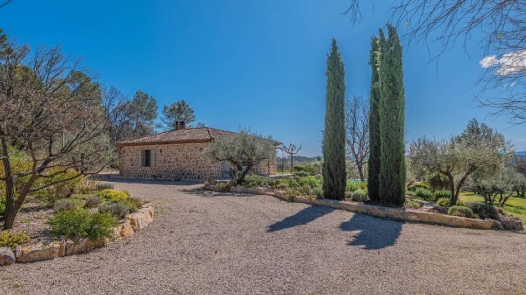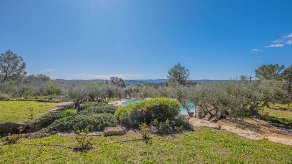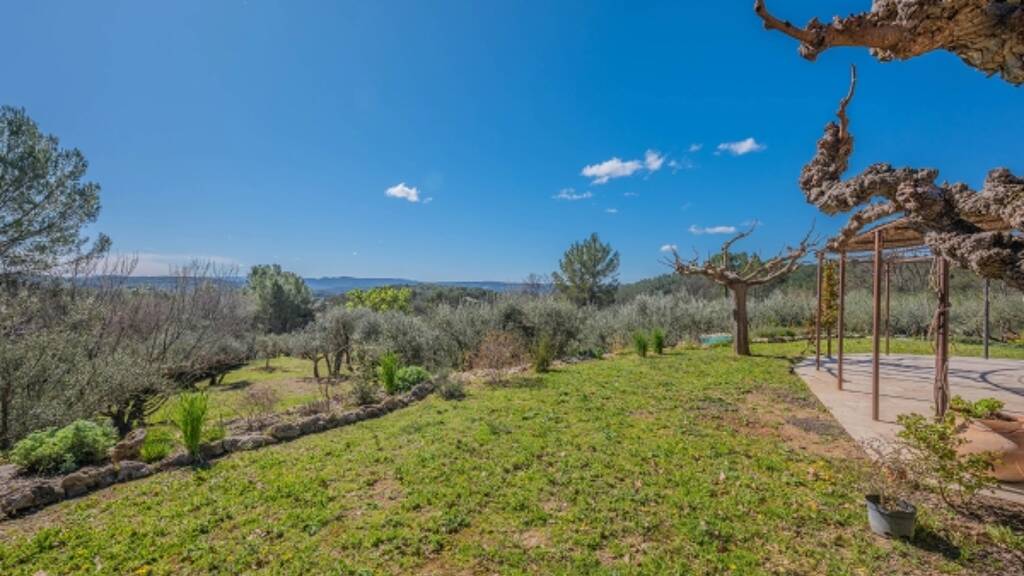 The 1. 5-hectare plot, largely enclosed, features an olive grove of over one hundred trees, producing up to 150 liters of organic olive oil each year. Traditional stone terraces ("restanques") structure the landscape, offering a rare setting that combines Mediterranean charm with complete privacy, all open to stunning views.