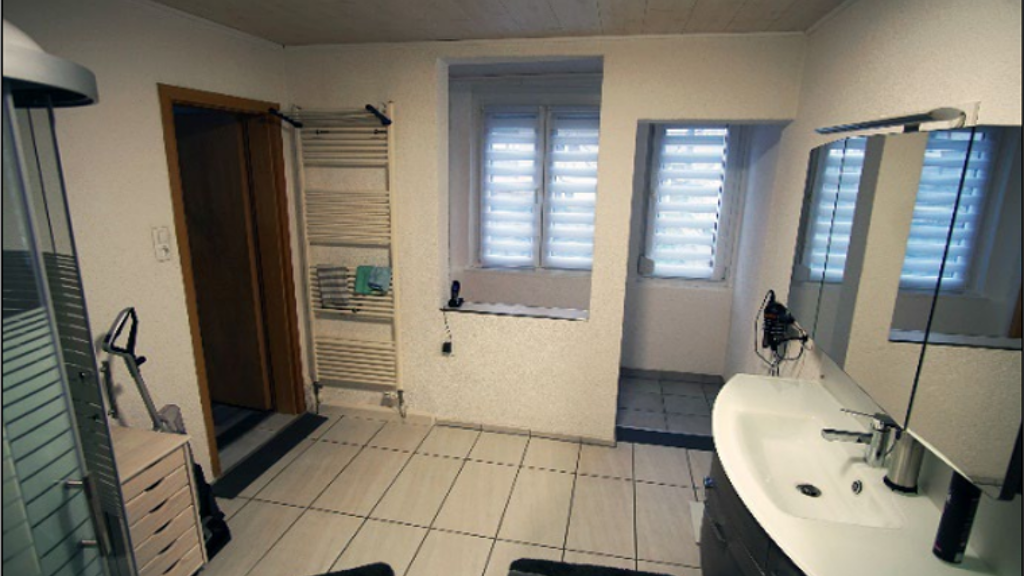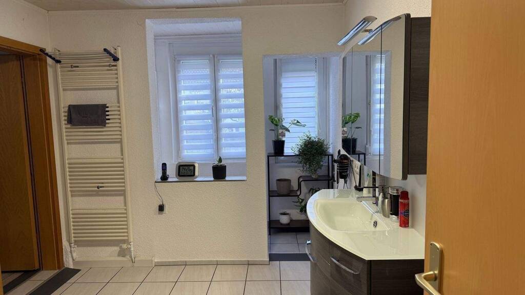 Im ersten Obergeschoss befindet sich eine Wohnung mit gleichem Grundriss. Sie verfügt ebenfalls über insgesamt drei Zimmer, eine separate Küche sowie ein Badezimmer mit Dusche, Doppelwaschbecken und WC.