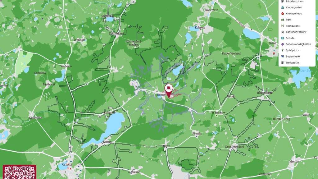 Die Lage in Demen verbindet ruhiges Wohnen im ländlichen Raum mit einer klaren Anbindung an die Region. Der Wohn und Erholungswert wird durch die naturnahe Umgebung geprägt. Mehrere Grünflächen liegen in der Nähe und eignen sich für kurze Wege ins Freie. Für Ausflüge bieten sich Badestellen und kleine Strandbereiche am Wasser in ca. 9 km an. In der Umgebung liegen zudem einzelne Ausflugsziele und Naturpunkte sowie weitere kleine Sehenswürdigkeiten im Umland. So entsteht ein Standort, der Alltag, Betreuung und Freizeit in der Region bündelt und zugleich einen klaren Rückzugsraum im Grünen bietet.