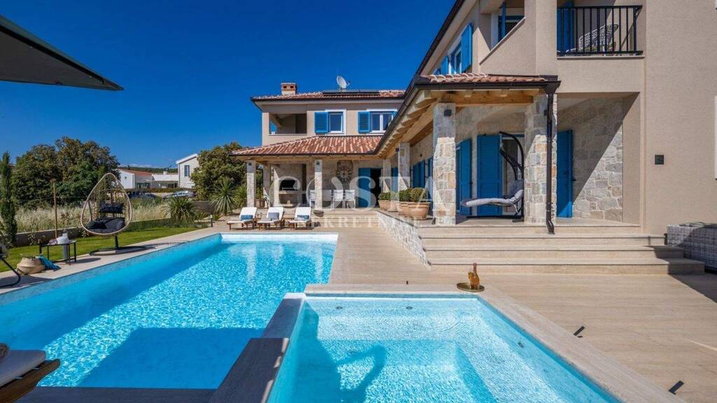 In Ugljan auf der gleichnamigen Insel steht eine luxuriöse Villa mit Pool zum Verkauf. Das Anwesen befindet sich auf einem großzügigen Grundstück von 773 m² und erstreckt sich über ein Erdgeschoss und ein Obergeschoss. Im Erdgeschoss befinden sich ein geräumiges Wohnzimmer, eine Küche mit Essbereich, ein Gäste-WC, ein Abstellraum und zwei Schlafzimmer mit jeweils eigenem Bad. Im Obergeschoss befinden sich ein weiteres Wohnzimmer mit Küche sowie vier Schlafzimmer mit jeweils eigenem Bad und Terrasse.