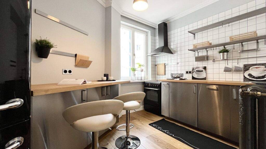 * Stylische Küche mit Bar, voll ausgestattetem Mobiliar in Edelstahlfronten, Einbaugeräten und freistehendem Retro-Kühl-Gefrierschrank in schwarz
