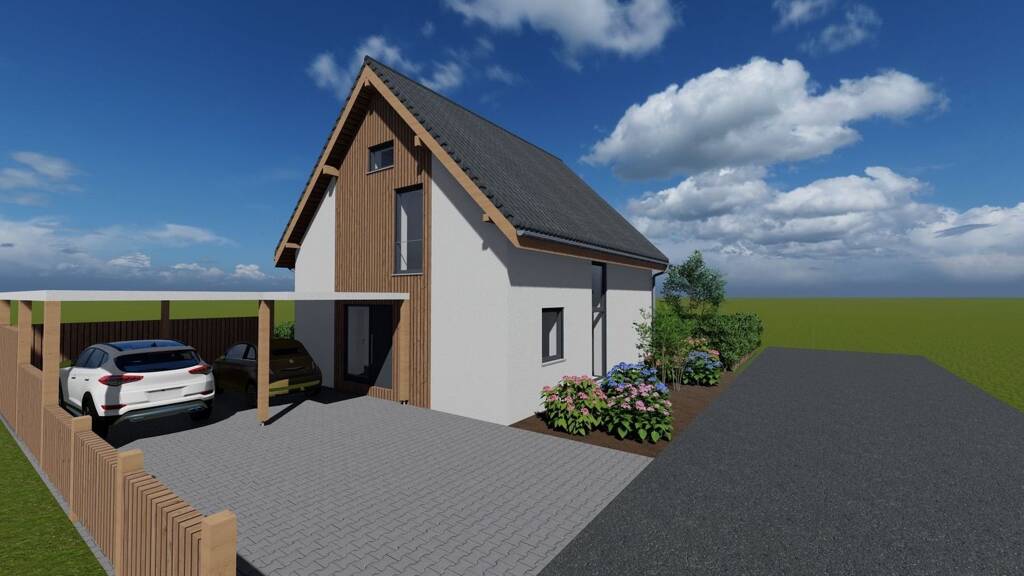 Hier entsteht ein Einfamilienhaus in Holzrahmenbauweise auf einem ca. 350 qm großen Grundstück an einer wenig befahrenen Anlieger Straße in Löhne Ostscheid, mit der Möglichkeit zur Errichtung eines Doppelcarports mit angrenzendem Abstellraum für Fahrräder und Gartengeräte. Das Haus hat eine Wohnfläche von ca. 110 qm und bietet so ausreichend Platz für eine 4-köpfige Familie. Es besticht durch seine moderne und gradlinige Architektur.