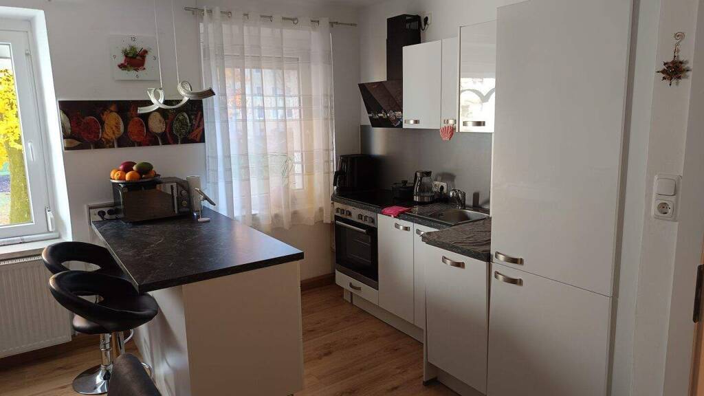 * helle Essküche mit genügend Platz für eine Sitzgelegenheit und moderne Küchenzeile