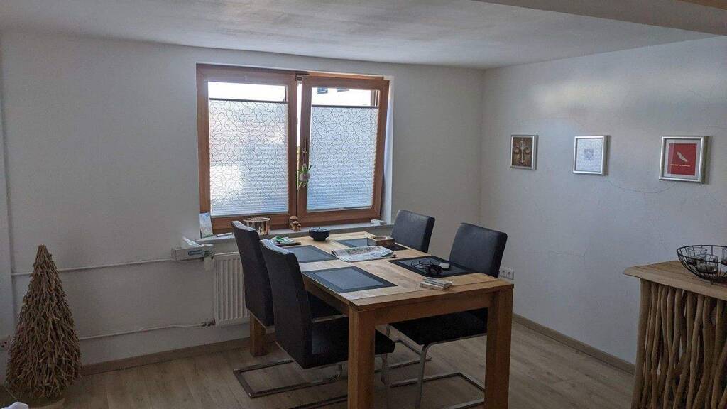 Im Erdgeschoss befindet sich auf der linken Seite das helle Esszimmer (alle Bilder in der Reihenfolge der Objektbeschreibung), das reichlich Platz für gemeinsame Mahlzeiten bietet und durch seine Nähe zur gegenüberliegenden Küche den Alltag erleichtert. Diese verfügt über einen einladende Küchenbereich, ausgestattet mit einer gepflegten Einbauküche, die Bestandteil des Objektes ist.