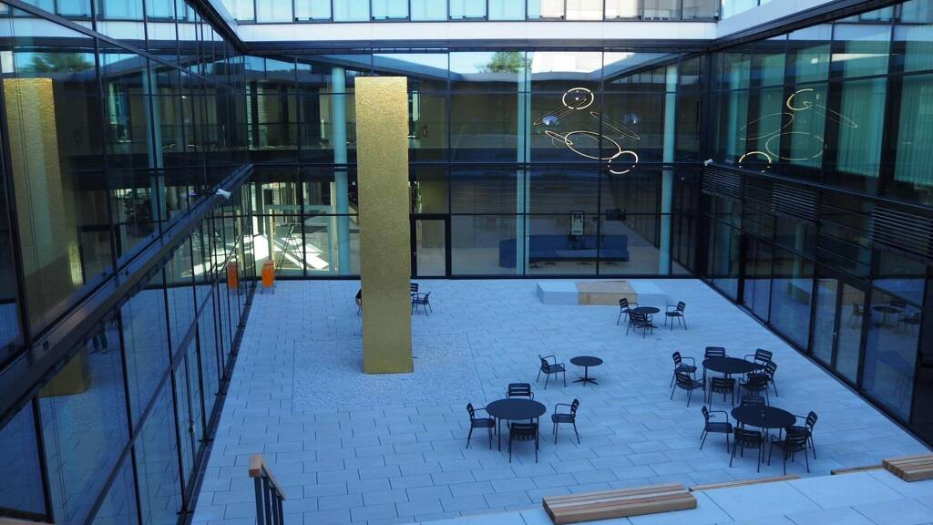 Im Sockelgebäude sind eine auch für alle Mieter nutzbare Kantine und temporär buchbare bzw. anmietbare großzügige Besprechungs- und Konferenzbereiche, für bis zu 200 Personen, untergebracht. Der Innenhof schafft lichtdurchflutete Räumlichkeiten und lädt zu entspannten Mittagspausen im Freien ein. An der Schnittstelle zwischen Büroturm und Sockelgebäude befindet sich das zentrale Foyer mit Empfangsbereich.