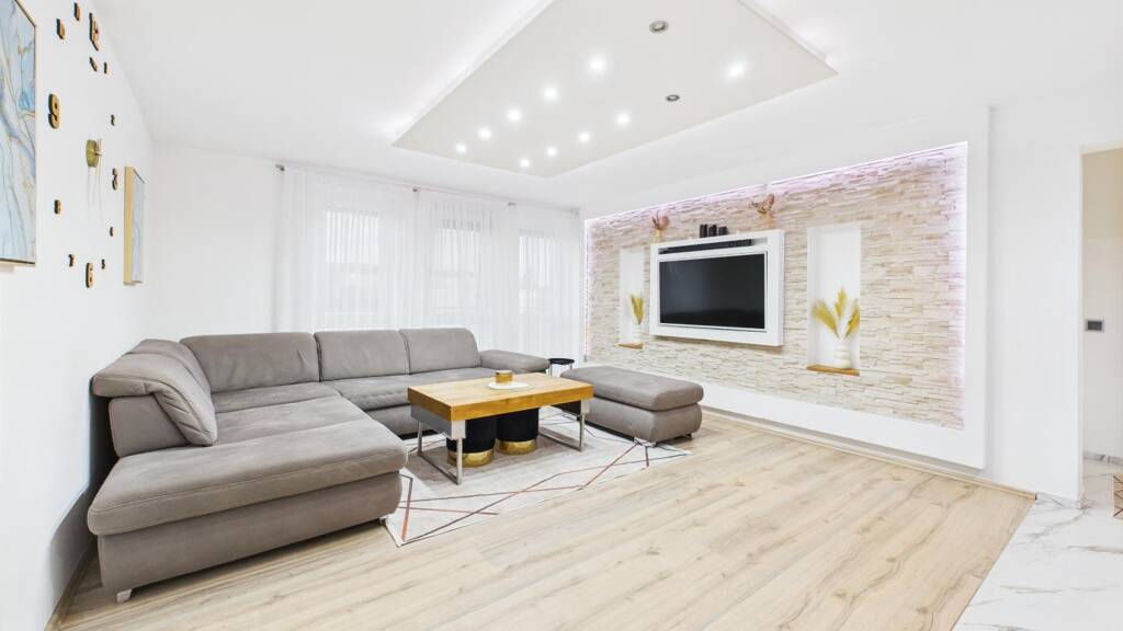 - Hochwertige Bodenbeläge, TV-Wand, Steinwand-Elemente und maßgefertigte Einbauten