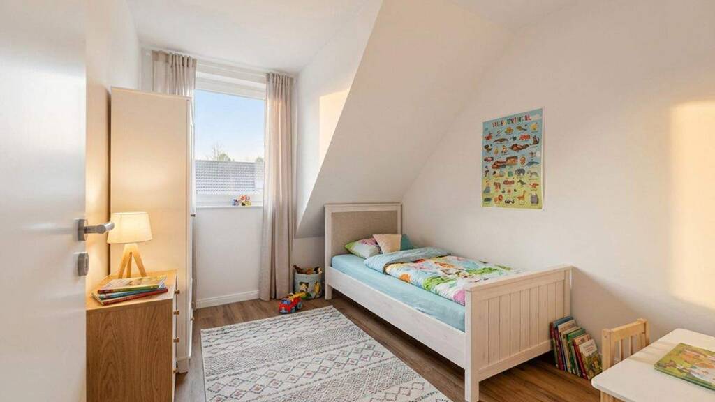 Das Haus verfügt über vier geräumige Zimmer, darunter drei komfortable Schlafzimmer und ein elegantes Badezimmer sowie weitere Fläche im Dachgeschoss, die zum Beispiel zum Arbeiten genutzt werden kann.