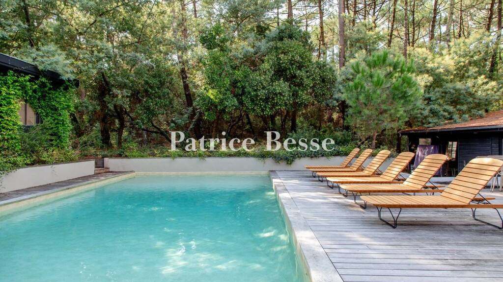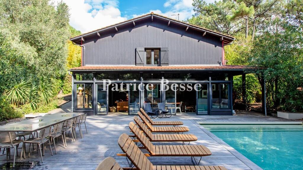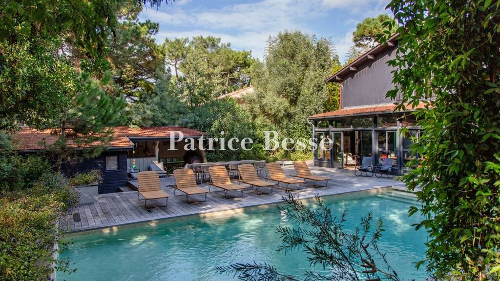 As for the conservatory, it gives on to the open kitchen, with its pantry, as well as the living area with its fireplace, in which a wood-burning stove has been installed, while a hallway leads to the sleeping quarters with its two bedrooms, each with their own private shower room and lavatory, as well as another bedroom and a separate shower room with a lavatory.The Summer KitchenFrom the patio, a few steps provide access to an outdoor seating area and its summer kitchen, which blends harmoniously in with its natural surroundings and is slightly set back from the swimming pool in order to provide extra comfort and privacy.The OutbuildingResembling the kind of wood cabins ubiquitous on Cap Ferret, it includes two small bedrooms and an independent shower room.The GuesthouseLocated on the upper part of the property, it is accessible via a pedestrian door followed by a wood-plank path. Featuring an independent, fitted kitchen with a pantry as well as a living room with a fireplace, which looks out on to a wooden patio, the sleeping quarters contain four bedrooms, each with their own private shower rooms, as well as a separate lavatory.The Garden, Swimming Pool and Deck AreaSurrounded by a fence and shaded by maritime pines, the garden is planted with strawberry trees and bay laurels at the foot of which extend a blanket of pine bark, while the saltwater swimming pool, 10 x 5 metres, is heated with a heat pump and faces fully south.