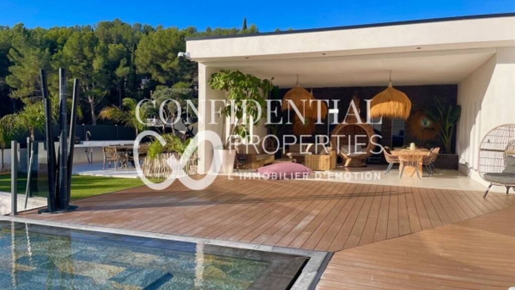 Eingebettet in üppiges Grün wird Sie diese moderne Villa von ca. 195 m² mit ihren großzügigen Proportionen, hochwertigen Annehmlichkeiten und ihrer ruhigen Atmosphäre verzaubern. Auf einem 1.260 m² großen Grundstück gelegen, öffnet sich das Anwesen zu einem schönen Eingang, der zu einem hellen 70 m² großen Wohnbereich führt, der ein Wohnzimmer, ein Esszimmer und eine offene Küche kombiniert. Große Erkerfenster lassen natürliches Licht herein und bieten einen freien Blick. Im Erdgeschoss befindet sich eine große Master-Suite mit Duschbad und WC sowie zwei Schlafzimmer mit jeweils eigenem Duschbad. Eine separate Toilette rundet diese Ebene ab. Im Obergeschoss finden Sie einen Büroraum (der leicht in ein Schlafzimmer umgewandelt werden kann), ein Badezimmer und ein zusätzliches Schlafzimmer. Der Außenbereich ist eine wahre Oase der Entspannung: Ein prächtiger 15 x 5 Meter großer Spiegelpool, ein 60 m² großes Poolhaus, ein 20 m² großes Spa und eine 45 m² große Doppelgarage vervollständigen dieses außergewöhnliche Anwesen. Die Villa ist außerdem mit Sonnenkollektoren ausgestattet, die modernen Komfort und Energieeffizienz vereinen. Der Preis beinhaltet die vom Verkäufer zu zahlenden Maklergebühren. Für weitere Informationen wenden Sie sich bitte an : Zélia MICHEL Tel: +33 6 88 06 05 41 E-Mail: oder Gabrielle AGRICOLE RSAC 922 145 594 Tel. : 06 37 76 94 68 E-Mail: