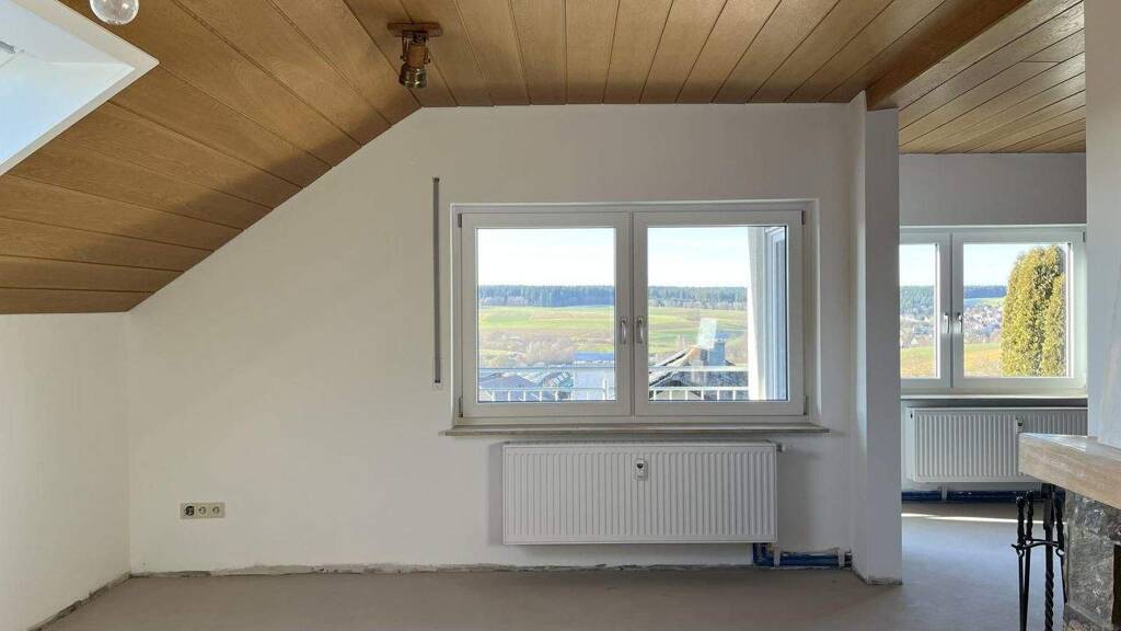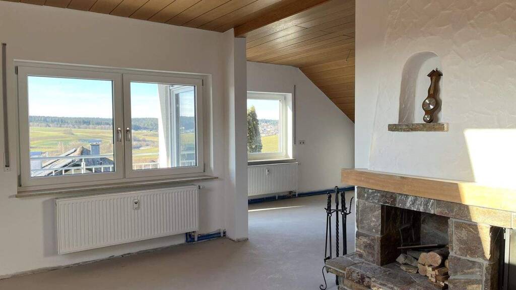 Das im Jahr 1980 errichtete Haus liegt in einer sehr ruhigen und naturnahen Wohnlage von Tumlingen. Die Wohnung befindet sich im Dachgeschoss und überzeugt durch ihren großzügigen und gut geschnittenen Grundriss. Herzstück der Wohnung ist das helle Wohn- und Esszimmer mit Ofen, das eine angenehme Wohnatmosphäre schafft. Von hier aus gelangt man auf den großen, überdachten Balkon, der eine schöne Weitsicht über Tumlingen, Lützenhardt sowie Wiesen, Felder und Wald bietet. Der offene Essbereich bietet ausreichend Platz für den Einbau einer Einbauküche, die der Mieter ganz nach eigenen Vorstellungen gestalten kann. Zusätzlich verfügt die Wohnung über ein Schlafzimmer sowie ein weiteres Zimmer, das sich ideal als Kinder- oder Arbeitszimmer eignet. Das Badezimmer wird derzeit renoviert und wird nach Fertigstellung mit einer Dusche, einem Waschbecken und einer Toilette ausgestattet sein. Der Stil des neuen Badezimmers ist den Bildern zu entnehmen. In der Küche, im Badezimmer und im Flur wird ein neuer Fliesenboden verlegt, in den übrigen Räumen ein hochwertiger neuer Vinylboden. Um die Nebenkosten möglichst gering zu halten, übernehmen die Mieter die Kehrwoche sowie den Winterdienst im Wechsel mit den anderen Hausbewohnern. Optional können eine Garage für 50,00 € monatlich sowie Stellplätze für jeweils 25,00 € monatlich angemietet werden. Die Wohnung befindet sich in einem äußerst ruhigen Wohngebiet und ist ideal für Paare oder eine kleine Familie, die naturnahes Wohnen zu schätzen wissen.