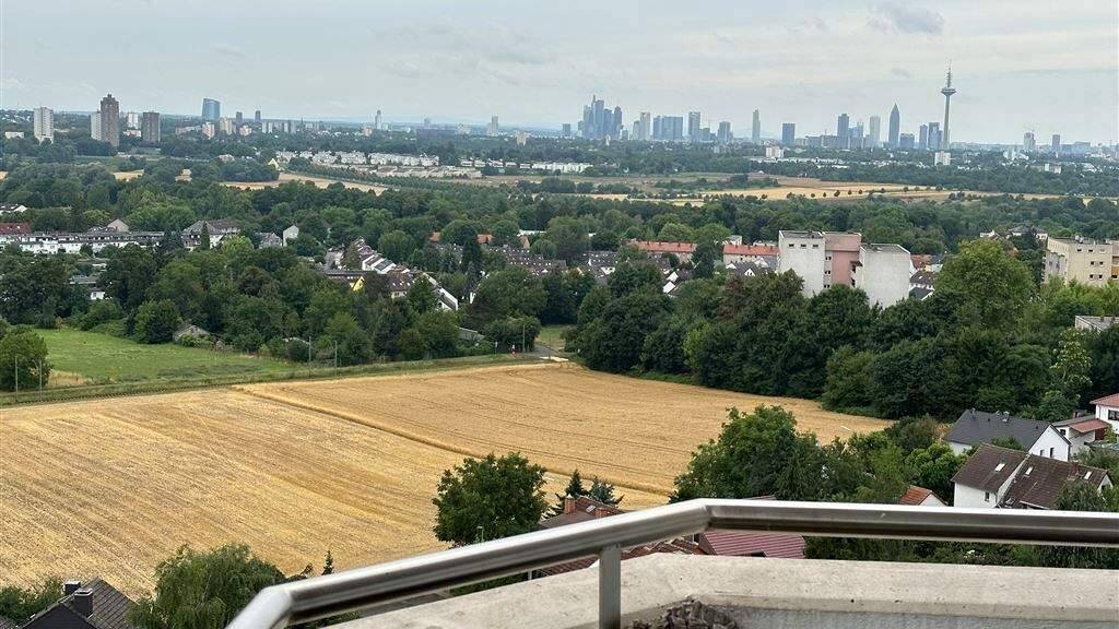 Das lichtdurchflutete Wohnzimmer, das mit seinem Zugang zu einem großzügigen Balkon und der einmaligen Aussicht auf die Skyline von Frankfurt punktet - ein Ort zum Entspannen. Von hier aus genießen Sie einen herrlichen Blick in die umliegende, grüne Landschaft (Felder und Wiesen und die Skyline Frankfurts mit dem neuen Gebäude der Europäischen Zentralbank).