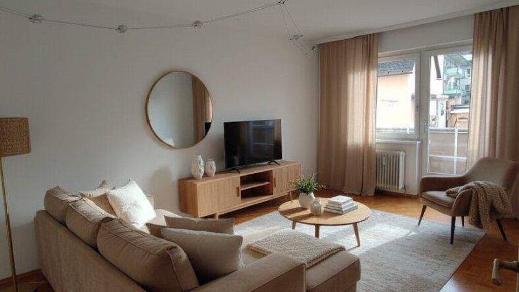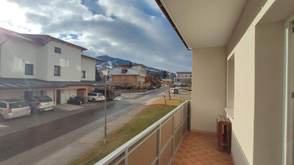 Die Wohnung befindet sich im leicht erreichbaren ersten Halbstock und genießt gleichzeitig die Vorzüge einer vom großen Wohnzimmer begehbaren sonnigen Loggia mit Bergblick. Auf der Loggia haben eine Sitzgarnitur, ein Tisch und ein Kästchen ausreichend Platz.