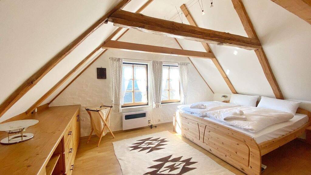 Über eine charmante Treppe gelangt man in das Dachgeschoss mit einem hellen Schlafzimmer sowie einem weiteren Duschbad mit WC - ideal für erholsame Urlaubsaufenthalte oder entspannte Wochenenden.