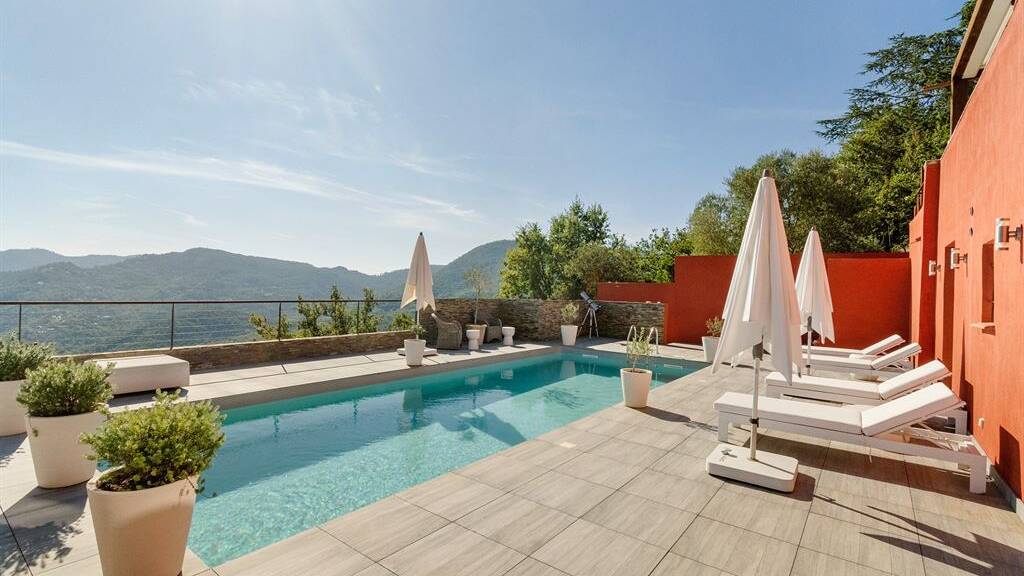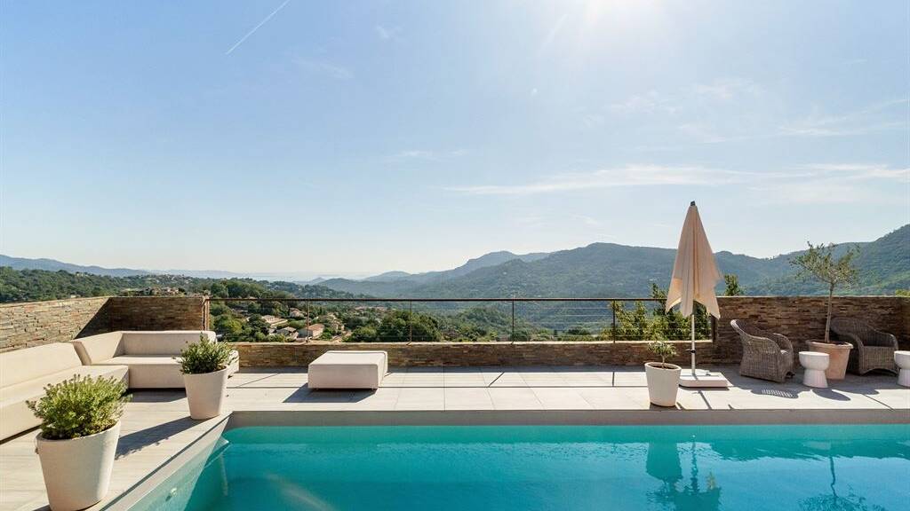 Outside, the property includes a swimming pool with views of the Esterel massif and the Mediterranean, as well as a shaded terrace.