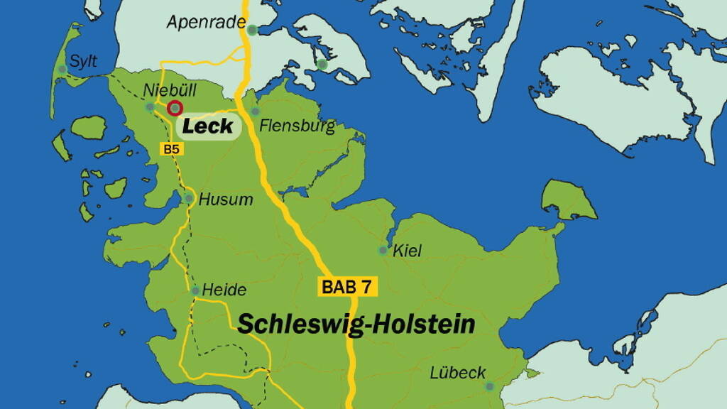 - südlich von Leck B 5 (Hauptverbindungsachse in Nord-Süd-Richtung entlang der schleswig-holsteinischen Westküste in Richtung Süden zur A 23)