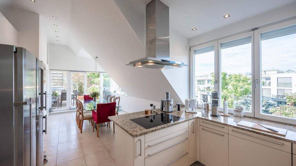 Das Penthouse erstreckt sich über zwei Ebenen eines sehr gepflegten Mehrparteienhauses. Die Raumaufteilung ist durchdacht und großzügig - mit fließenden Übergängen zwischen Wohnen, Arbeiten und Entspannen.