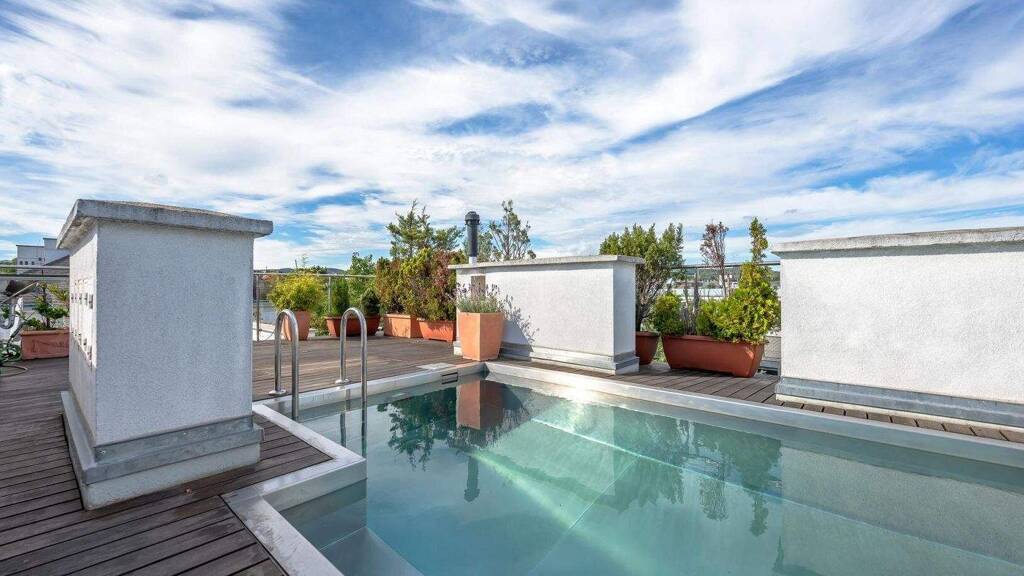Das Obergeschoss besticht durch einen lichtdurchfluteten Wohnsalon mit offenem Kamin, eine offen gestaltete Designküche mit Essbereich sowie zusätzliche Lagermöglichkeiten. Das absolute Highlight: Die oberste Dachterrasse mit unverbaubarem Wien-Blick und einem Pool mit Edelstahlbecken und Gegenstromanlage - exklusiver lässt sich Entspannung kaum inszenieren.