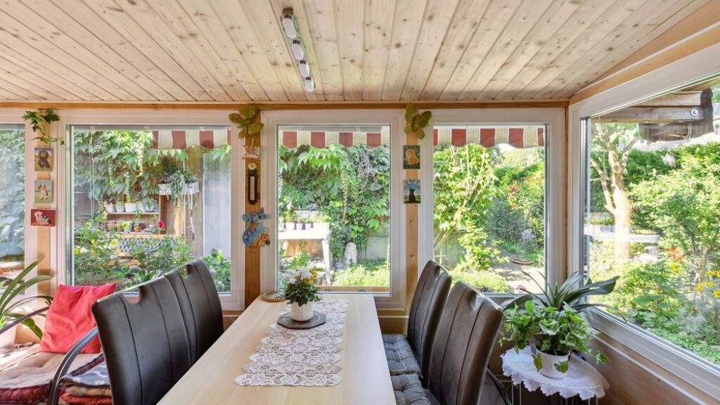 Im Erdgeschoss lädt das helle Wohnzimmer mit seiner offenen Küche zu geselligen Stunden ein. Ein besonderes Highlight bildet das Esszimmer, das wie ein Wintergarten mit einen zauberhaften Ausblick in den grünen Garten gestaltet ist.