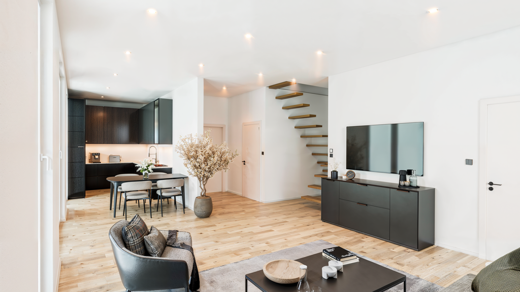 Die großzügig geschnittene Wohnung beeindruckt durch klare Linien, hohe Decken und eine durchdachte Raumaufteilung über zwei Ebenen. Der offene Wohn- und Essbereich bildet das Herzstück dieses besonderen Domizils: großflächige Fensterfronten lassen Licht und Natur eins werden und schaffen eine Atmosphäre, die Leichtigkeit und Geborgenheit zugleich vermittelt.