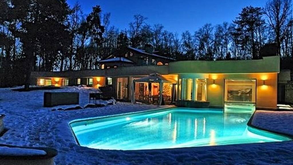 Im Erdgeschoss ist ein weiteres großes Wohnzimmer, mit Kamin, eine Küche, die Bar und ein beheiztes Hallenbad mit integriertem Whirlpool. Das Hallenbad ist durch eine zu öffnende Scheibe vom Außenpool getrennt und hat insgesamt beachtliche ca. 25 Meter Länge.