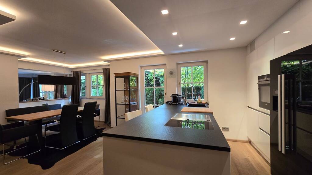Die Gartenwohnung teilt sich auf in einen offen gestalteten Wohn- und Essbereich mit Einbauküche, ein Wohnzimmer mit offenem Kamin, ein Hauptschlafzimmer mit modernem Bad inklusive Dampfbad und Ankleidezimmer, ein Gästeschlafzimmer, ein weiteres Badezimmer, ein Gäste-WC sowie einen Abstellraum.