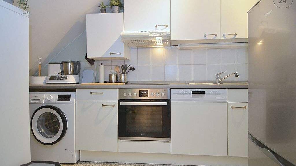 Die offene Einbauküche mit Geschirrspüler und Kaffeemaschine ist voll ausgestattet. Hier befindet sich die Waschmaschine und steht dem Mieter zur Verfügung.