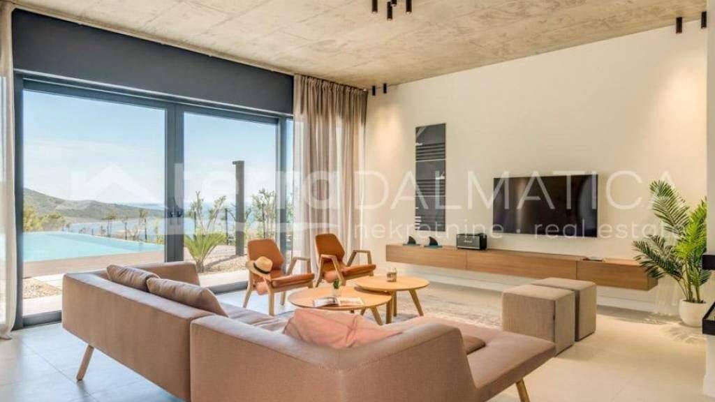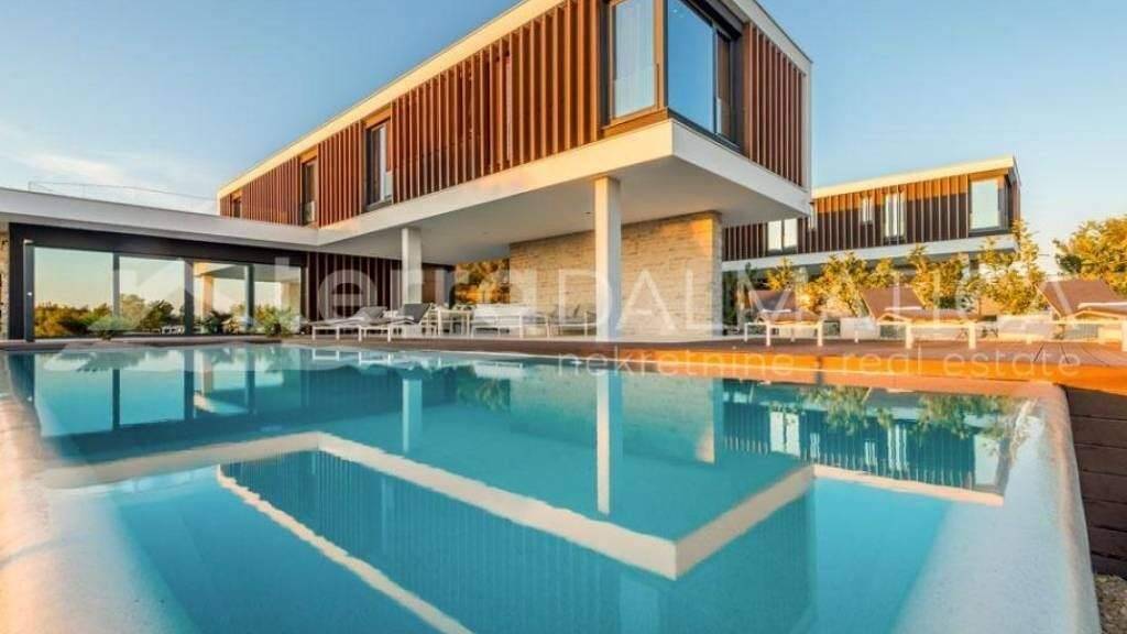 In Primosten steht eine Luxusvilla mit Swimmingpool und Meerblick zum Verkauf. Schöne Villa mit modernem Design befindet sich am Stadtrand von Primosten, auf einem Hügel mit wunderschönem Panoramablick auf die Stadt, das Meer und die Inseln. Die Villa erstreckt sich über zwei funktionale und gut durchdachte Etagen. Das geräumige Erdgeschoss mit offenem Konzept verfügt über eine voll ausgestattete Küche, ein Esszimmer, ein Wohnzimmer mit Kamin, eine Toilette und eine Waschküche. Das Wohnzimmer öffnet sich auf eine überdachte Terrasse mit einem beheizten Pool von 48 m2 und einem wunderschön angelegten Garten. Eine Holztreppe führt in den ersten Stock, wo sich vier Schlafzimmer mit jeweils eigenem Bad befinden. Eines der Zimmer hat Zugang zu einer großen Terrasse mit herrlichem Meerblick. Bei der Innen- und Außengestaltung wurde auf jedes Detail geachtet, damit die Villa Modernität, Funktionalität und Luxus ausstrahlt. Der Garten ist wunderschön eingerichtet, mit Grünflächen, die automatisch bewässert werden. Im Hof ??gibt es eine Garage für zwei Autos und einen Maschinenraum mit Poolausrüstung, und am Eingang zum Hof ??gibt es Parkplätze für vier Autos. Die Villa ist für wahre Liebhaber von Ruhe, mediterranem Ambiente und einem entspannten Lebensstil konzipiert. Die Villa hat ein großes Investitionspotential in Form von touristischer Vermietung. Primosten ist ein wunderschöner dalmatinischer Ort, der weithin für seine Kiesstrände bekannt ist. Es ist einer der malerischsten kleinen Orte an der Adria, mit vielen charakteristischen engen Gassen in der Altstadt. Neben den Naturschönheiten können Sie in einem der vielen Restaurants in Primosten auch verschiedene Meeresdelikatessen und bekannte Weine genießen. Kontaktieren Sie unseren Agenten und planen Sie Ihre Tour.
