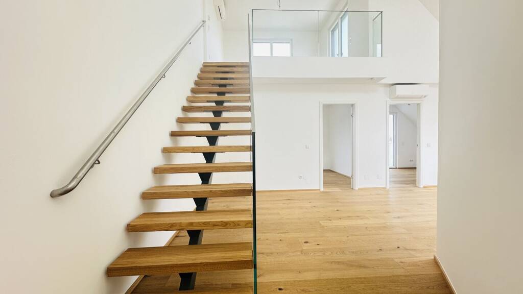 Mehrere Terrassen holen das Tageslicht und die Freiheit direkt ins Wohnen. Das Bad mit Fenster und das separate WC mit Fenster schaffen zusätzliche Offenheit und Komfort. Ein Lift im Haus sorgt für müheloses Ankommen auf jeder Ebene.