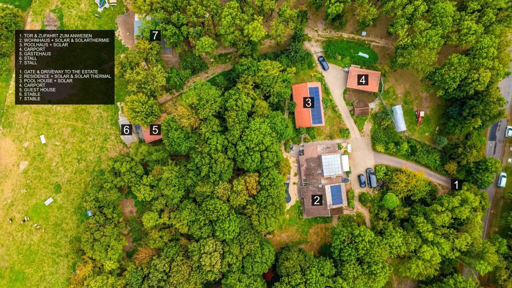 Besondere Akzente setzt der Außenbereich: Auf der weitläufigen Terrasse befindet sich ein großer Teich, der den Garten zu einem echten Blickfang macht. Hinzu kommen ein Poolhaus für entspannte Stunden, ein Gästehaus, Stallungen und ein Carport - ideale Voraussetzungen für vielfältige Wohn- und Freizeitideen.