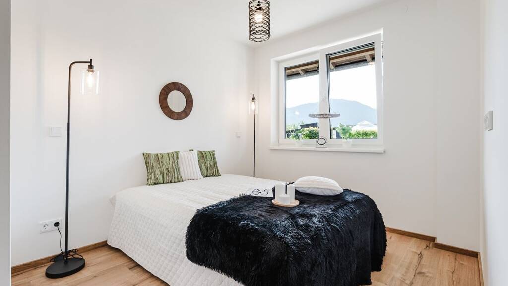 Hochwertige graue Feinsteinfliesen, Veneer-Parkett österreichischer Qualität und elektrische Rollläden schaffen ein modernes und behagliches Wohnambiente. Zur Wohnung gehört ein KFZ-Stellplatz (zzgl. € 12.000,-, verpflichtend) sowie ein Abstellraum/Kellerabteil im Erdgeschoss.