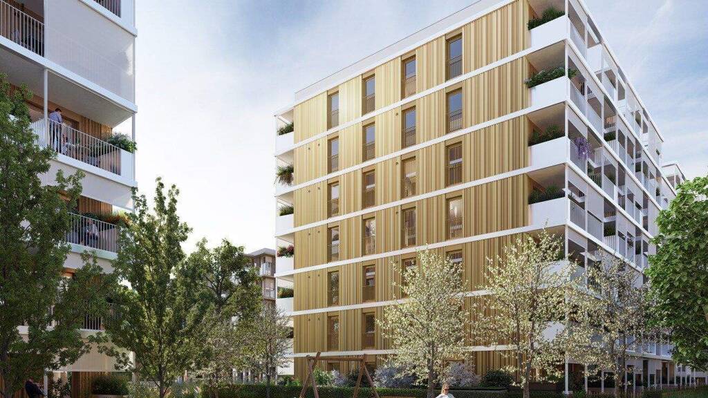 der textile Sonnenschutz an den Balkonfronten. Auf den Gründächern entsteht mit einem Biodiversitätskonzept neuer Lebensraum für Vögel und Insekten.