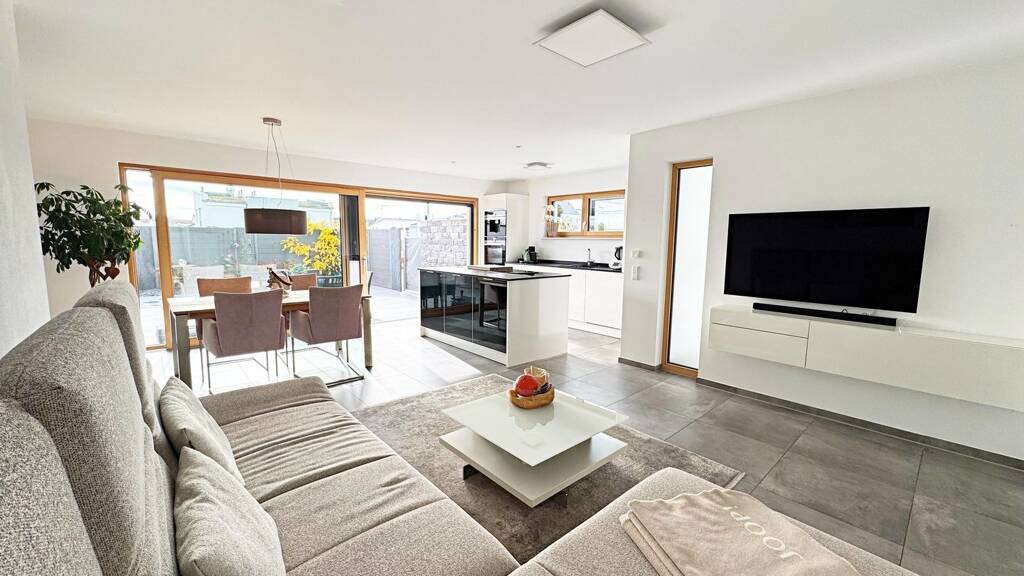 Herzstück des Hauses ist der offen gestaltete Wohn und Essbereich mit großen Fensterfronten und direktem Bezug zum Außenbereich. Hier entsteht eine Wohnatmosphäre, die Licht, Ruhe und Lebensqualität auf angenehme Weise vereint. Ob gemeinsames Essen mit der Familie, entspannte Abende oder Gäste empfangen im stilvollen Rahmen, dieser Bereich bietet den passenden Raum für viele Lebenssituationen.